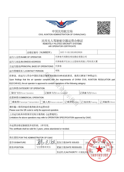 • 民用無(wú)人駕駛航空器運(yùn)營(yíng)合格證